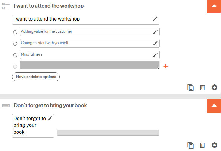 We want to show the question "Don't forget to bring your book" when a participants choice is "adding value for the customer" and "mindfulness". Click first on "adding value"