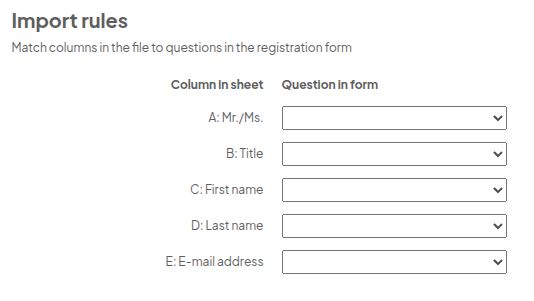 By selecting an option from the dropdown menu on the right, you will link the information from the Excel file to the corresponding question in your registration form. The corresponding information will be filled in for the registration of the participant. When a dropdown is left vacant, the information from that part of the Excel will not be imported.