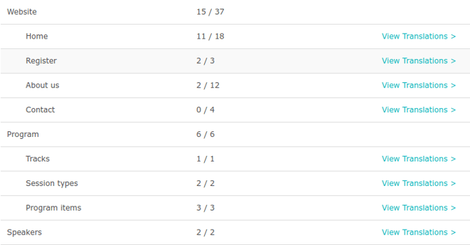 You can translate the event website pages in the Language Center, or directly in the Website. This is an example of the overview in the Language Center: