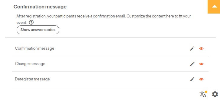 In the E-mail settings you can translate the confirmation message, change message and deregister message. To do this, click on the translations icon next to the message settings.