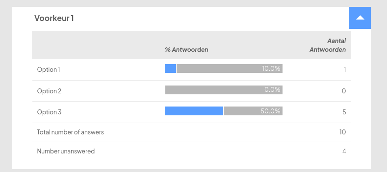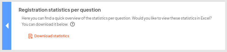 To get a quick overview of the data collected by the registration form, go to Statistics per question from the Dashboard. This page will show the statistics for the all questions from your registration form.