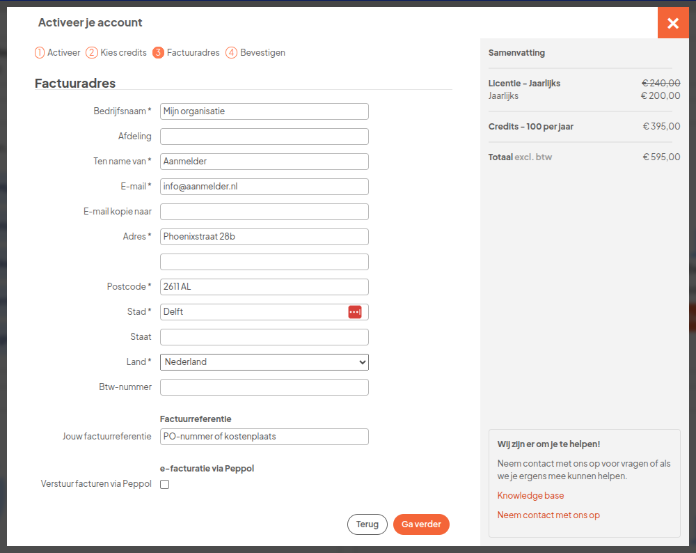 Vul je facturatieprofiel in. Je kunt een bestaand profiel selecteren of, als je een nieuwe organisatie aanmaakt, je facturatiegegevens handmatig invoeren. Dit is een belangrijke stap aangezien dit profiel gebruikt wordt voor alle facturen die met de licentie en credits te maken hebben, maar ook voor de uitbetaling van bijvoorbeeld deelnemersgelden.