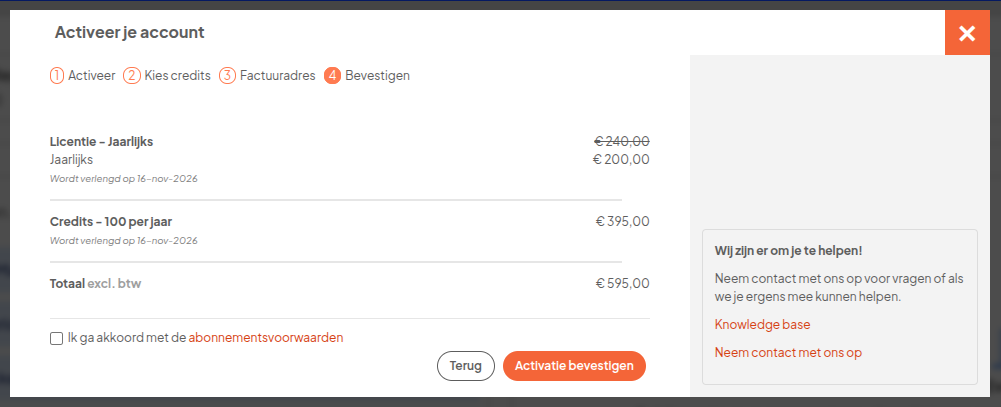 Controleer het totale aantal credits dat je hebt geselecteerd en de gekozen licentie. Klik vervolgens op de oranje knop 'Activatie bevestigen' om je keuze vast te leggen. Je ontvangt hierna meteen de factuur voor de licentie en credits.