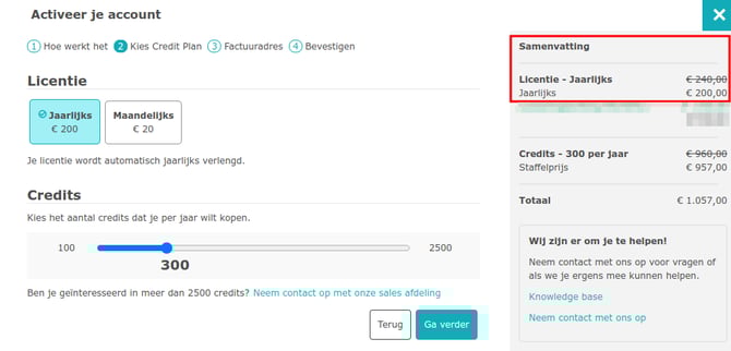 Aan de rechter kant zie je de kosten van je licentie en de korting die je krijgt bij een jaarlijkse licentie.