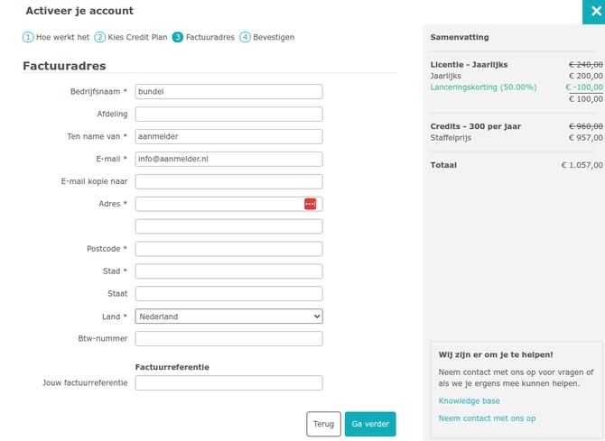 Vul je facturatieprofiel in. Je kunt een bestaand profiel selecteren of, als je een nieuwe organisatie aanmaakt, je facturatiegegevens handmatig invoeren.