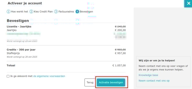 Controleer het totale aantal credits dat je hebt geselecteerd en de gekozen licentie. Klik vervolgens op 'bevestigen' om je keuze vast te leggen. Houd er rekening mee dat het na deze stap niet mogelijk is om het aantal credits te verminderen.