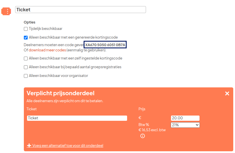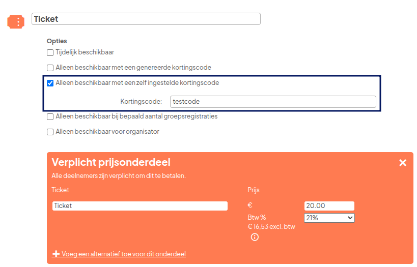 Je stelt hierbij de gewenste korting in. In bovenstaand voorbeeld is er een ticket gemaakt van 20 euro. Een deelnemer mag in dit geval dus voor 20 euro naar het evenement, wanneer de kortingscode is ingevoerd.